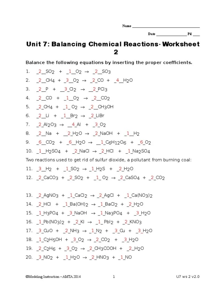 1) 1 n 2 + 3 h 2 → 2 nh 3 2) 2 kclo 3 → 2 kcl + 3 o 2 3) 2 nacl + 1 f 2 → 2 naf + 1 cl 2 4) 2 h 2 + 1 o 2 → 2 h 2 o 5) 1 pb(oh) 2 An equation is balanced when the same number of each element is represented on the reactant and product sides. You can use the steps you used previously to balance other equations to start, but then you have to take into account the key ions. This handy alphabet algebra equations worksheet is ideal for introducing children to solving equations in algebra, and is great for independent working. through the transition of arithmetic to algebraic reasoning, students will begin to be able to use letters, as well as other symbols alongside numbers. completing year 5 algebra worksheets is one of the best ways to get your kids. The earth's atmosphere exerts a pressure, as does any other gas. The printable worksheets are provided in pdf format with separate answer keys. Equations must be balanced to accurately reflect the law of conservation of matter. Answers to chemistry end of chapter exercises. The ionization of hydrated metal ions. Balancing chemical equations inquiry lab: Unlike the group 1 and 2 metal ions of the preceding examples (na +, ca 2+, etc.), some metal ions function as acids in aqueous solutions. Apr 02, 2020 · when you find difficulty in balancing the equation in the balancing chemical equations worksheet, you can miss it with a fraction of ½ and that will easily balance the equation. Jan 04, 2019 · this is a collection of printable worksheets to practice balancing equations.
